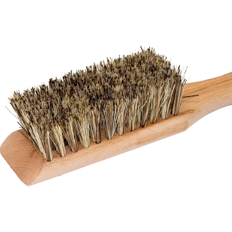 De combinatie van een houten schraper en stijve vezels zorgt voor een krachtige reiniging zonder schade aan je gereedschap.
